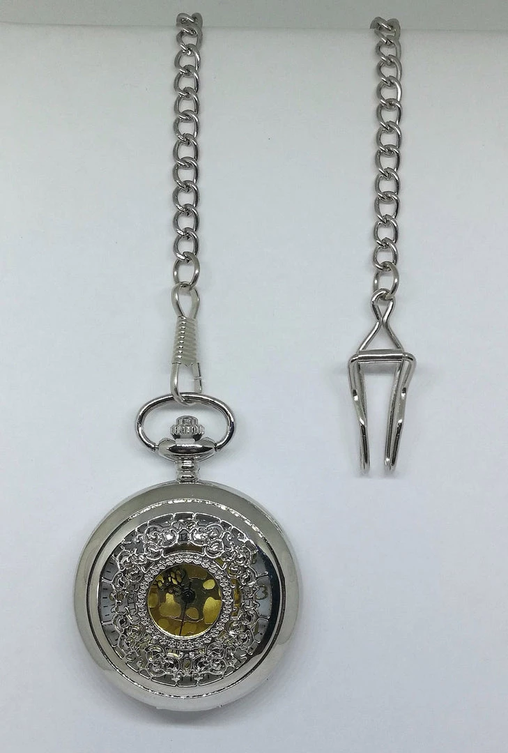 4.5cm silver pocket watch with white and gold watch face featuring silver chain and pants clip.