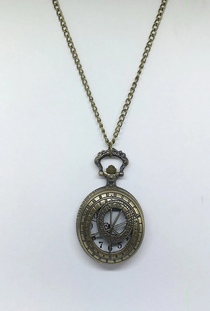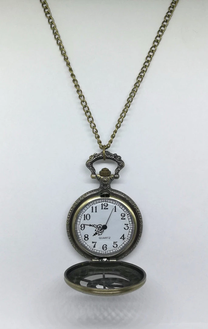 Small ornate pocket watch in bronze with classic watch face and matching bronze chain