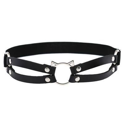 Black PU Leather Garter with silver kitty cat feature o-ring detail. One Size.