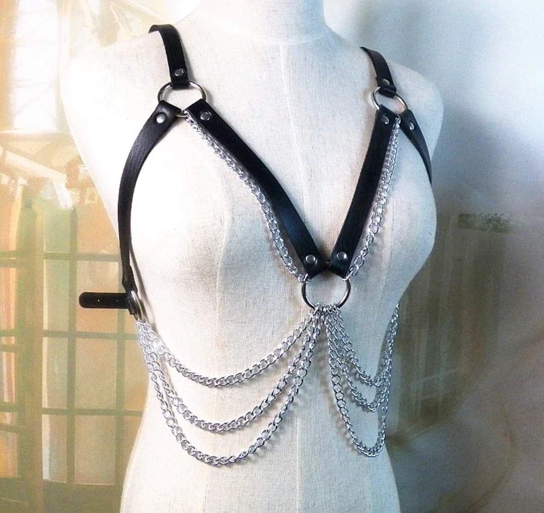 This harness is ideal for people who want a little pop on their outfits! A faux leather harness with gold chains draped around. Also available in gold.