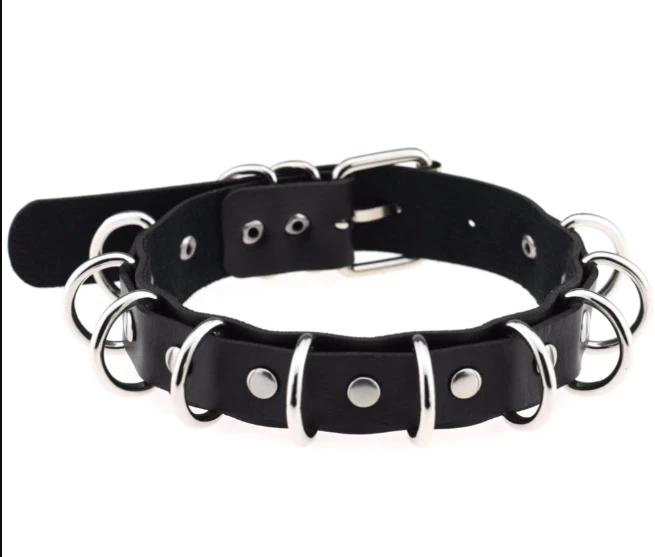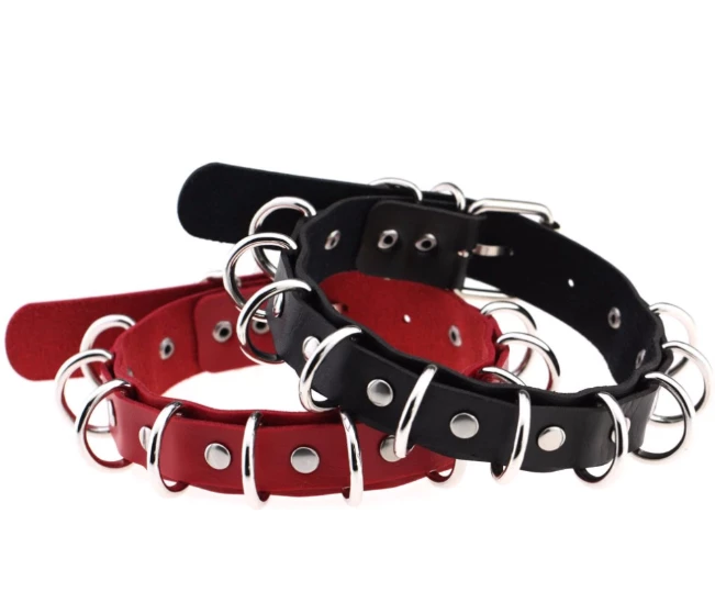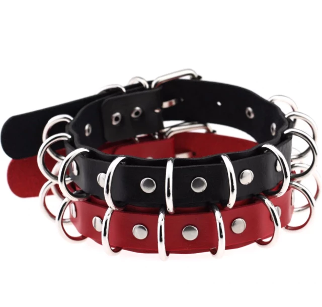 Soft faux leather choker with adjustable buckle closure at the back and O-Rings.