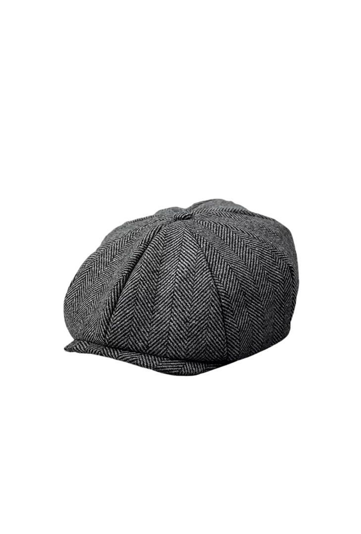 This dark grey and black news boy style cap features diagonal line patterns in a soft wool fabric. Lined with a short firm brim, this hat is perfect for winter or to top off your next Gatsby or 1920s outfit!