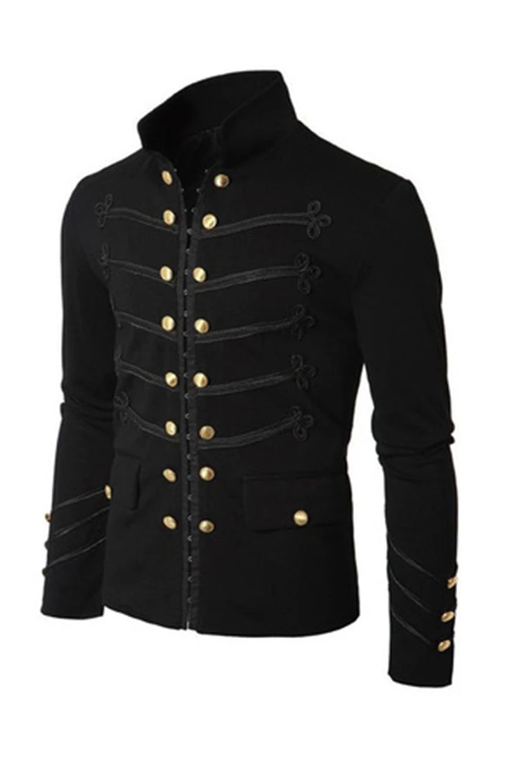 Jacket features a black high-neck collar with gold buttons down the middle of the jacket with rows of black rope trim patterns on the front with gold buttons on the long sleeve wrist.