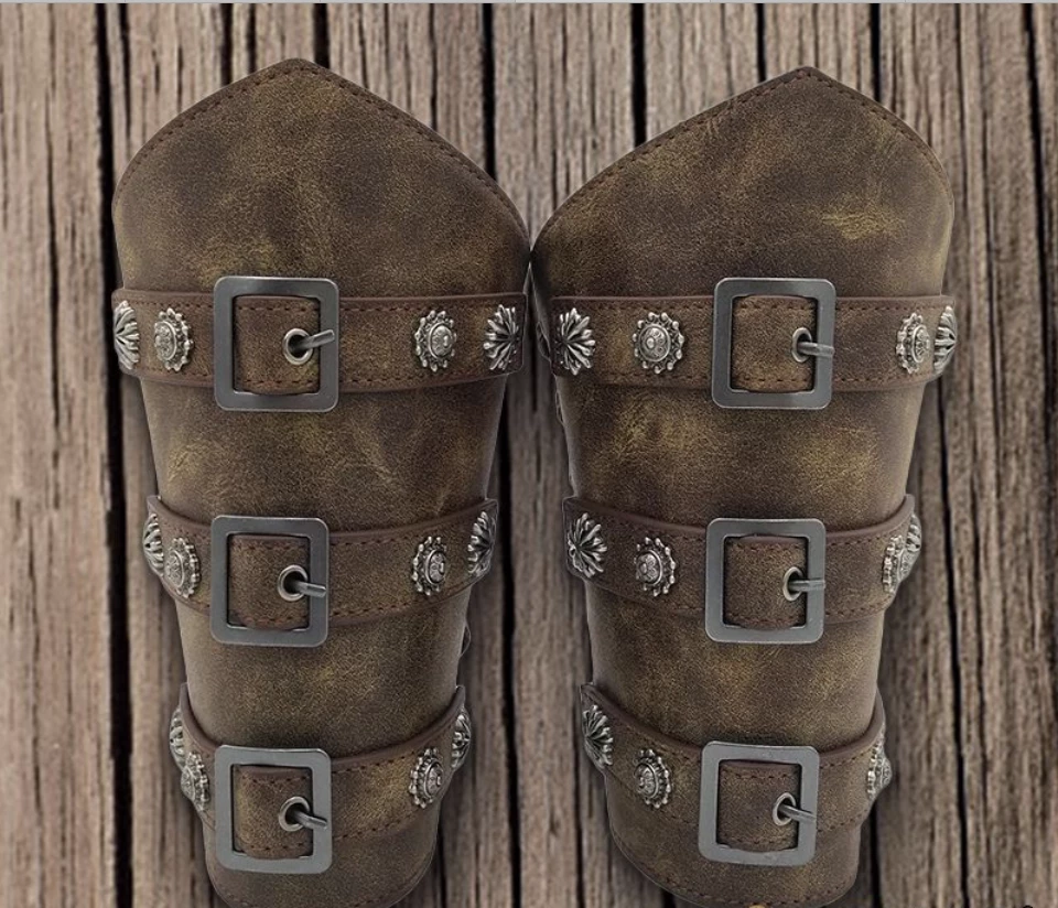 These brown leathery viking warrior cuffs feature 3 buckles and small decorative studs. A striking accessory to complete a viking, barbarian, roman or medieval warrior costume.