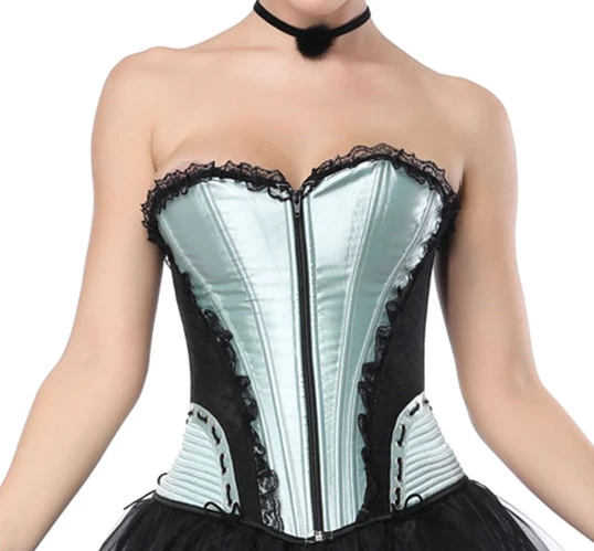 elegant shaper overbust corset with a zip front and lace and ribbon detailing. features hip details to give you an hourglass figure.