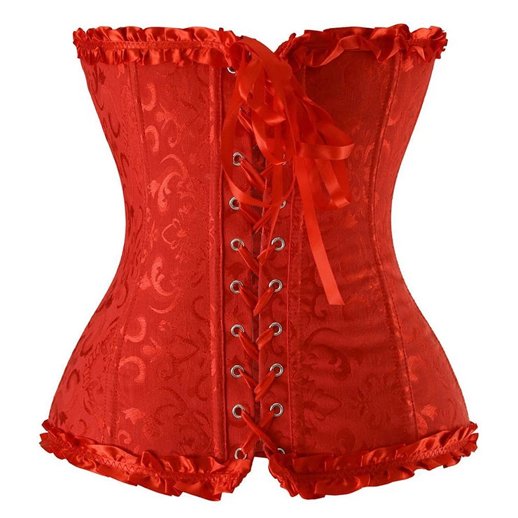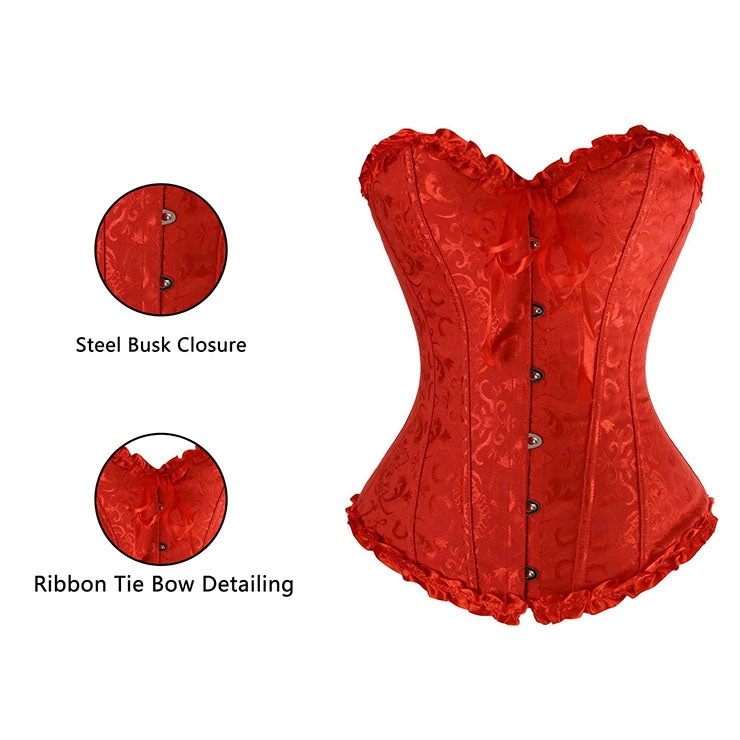 Classic red overbust corset with subtle jacquard print, busk closure and laceup back.