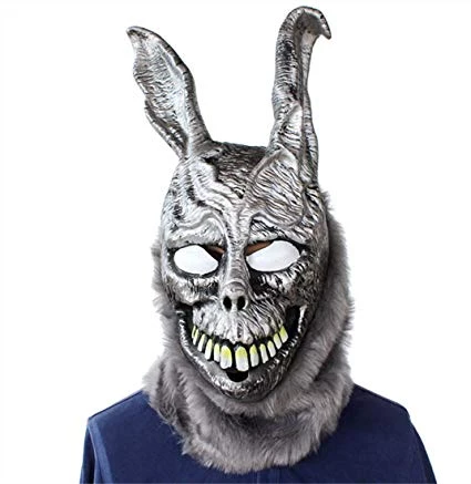 Silver latex face mask with ears and fur hood that covers the neck. Has eye holes, nose holes and small mouth hole.