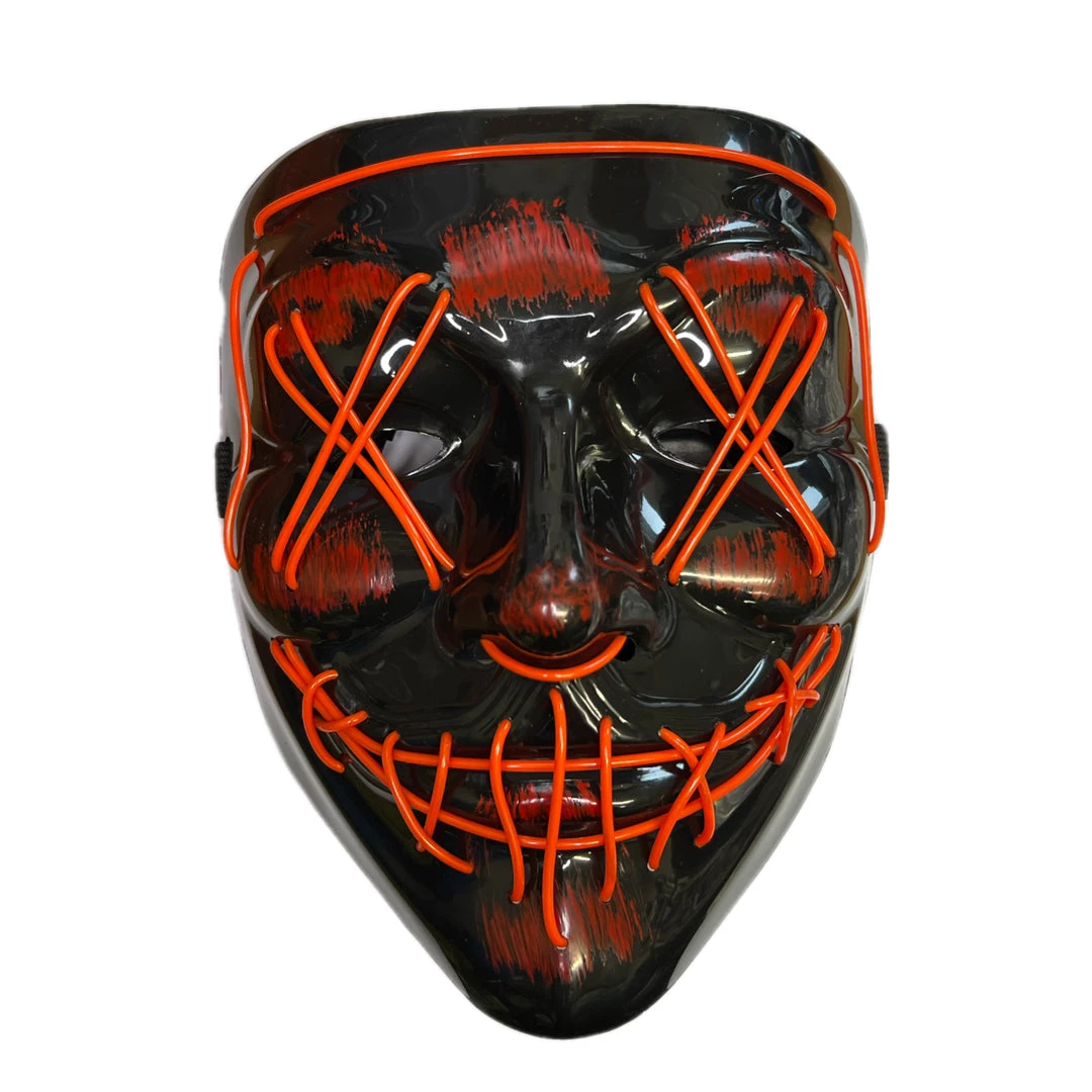 Hard plastic face mask with light-up EL wire woven into the design.