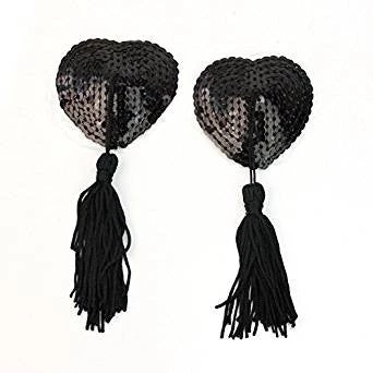 Black sequined nipple pasties in the shape of a love heart with black tassels. Self adhesive backing.
