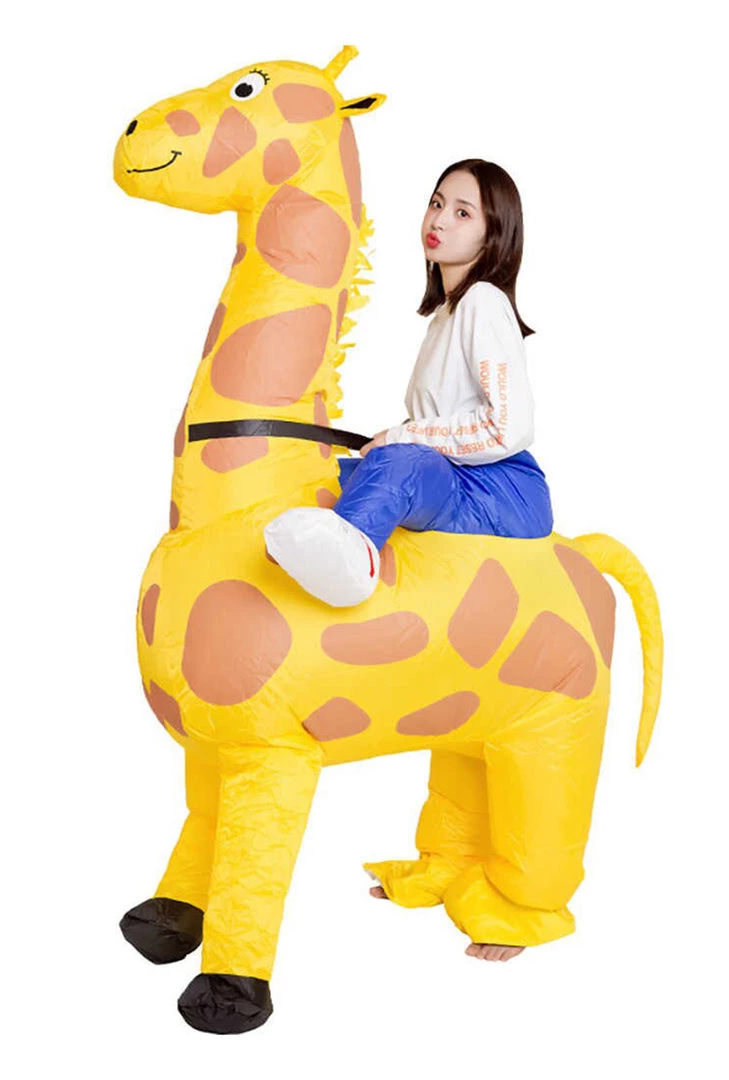 This sensational Inflatable Giraffe Carry me Costume includes the Giraffe Inflatable suit, a fan to inflate the suit with a battery case (batteries not included).