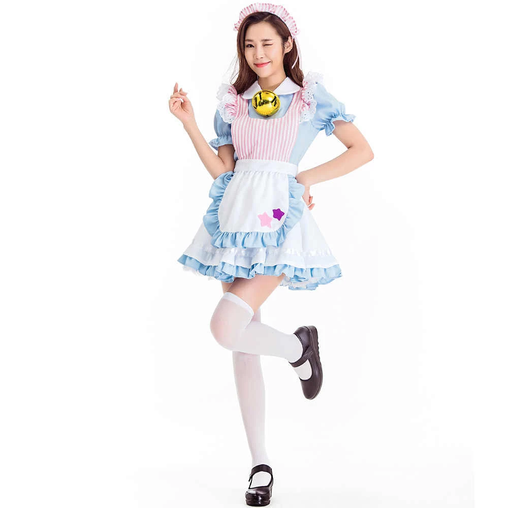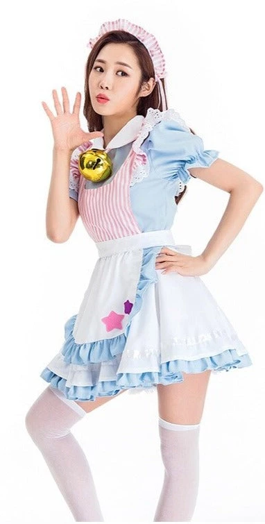 This Super Duper cute Lolita Alice Maid Costume includes a Pink Frill Headband, a Maid Dress with a tie-up apron with a super adorable Large Bell!