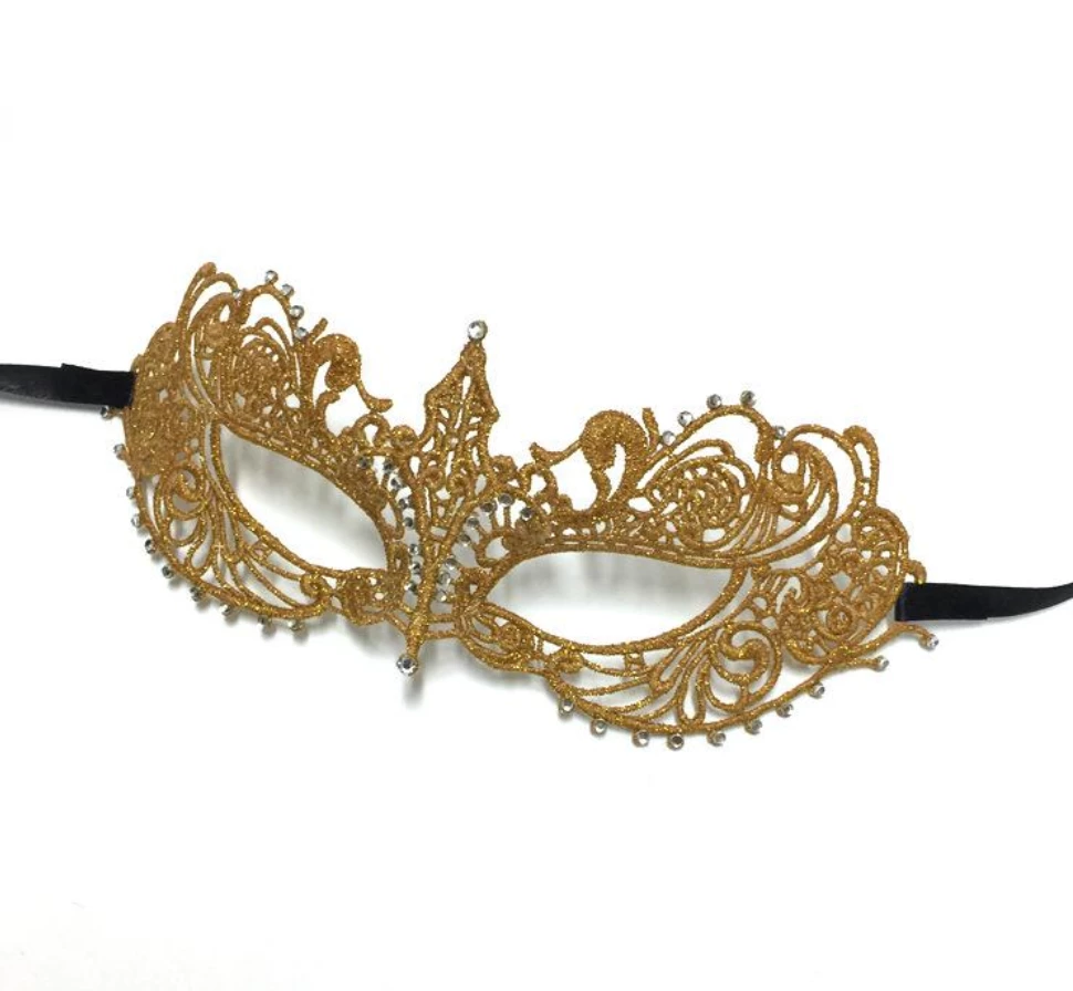 Gold glittery cut out mask with diamonds and satin ribbon to tie at the back