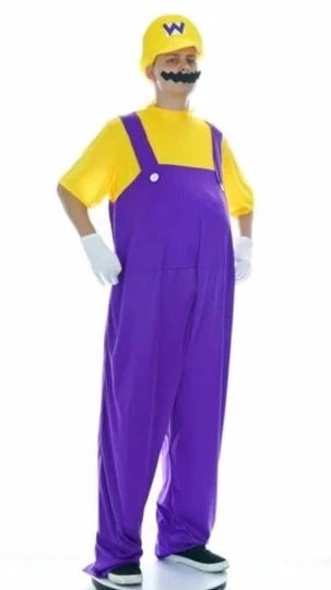 All in one attached shirt and jumpsuit with matching yellow hat with “W” print, moustache and gloves. Pair it with an inflatable belly to get Wario’s round shape!