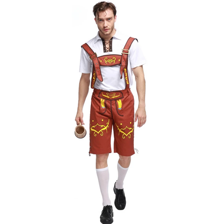 Includes knee length red-brown shorts with adjustable matching suspenders and a white shirt featuring a lace-up front.