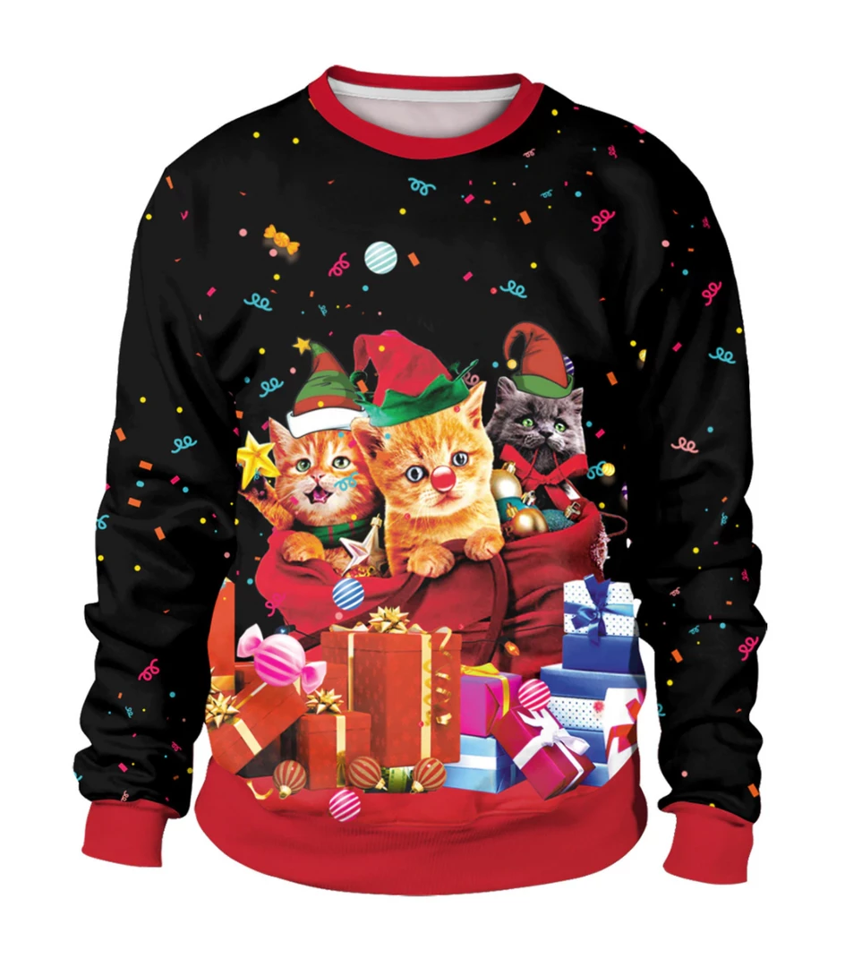 Unisex Christmas Sweater with kittens and cats print. Confetti on the front and back. M – 2XL.