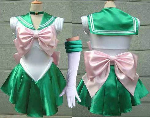 By the power of Jupiter! This gorgeous little green and white dress is perfect for your next Sailor Jupiter cosplay or anime costume party. Pink Bow attached at the chest and lower back and green sailor collar. Complete the look with our long curly brown wig and green heeled boots.