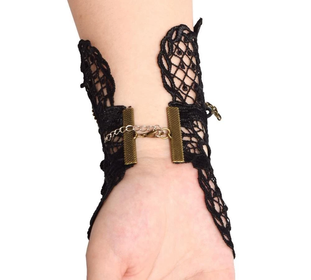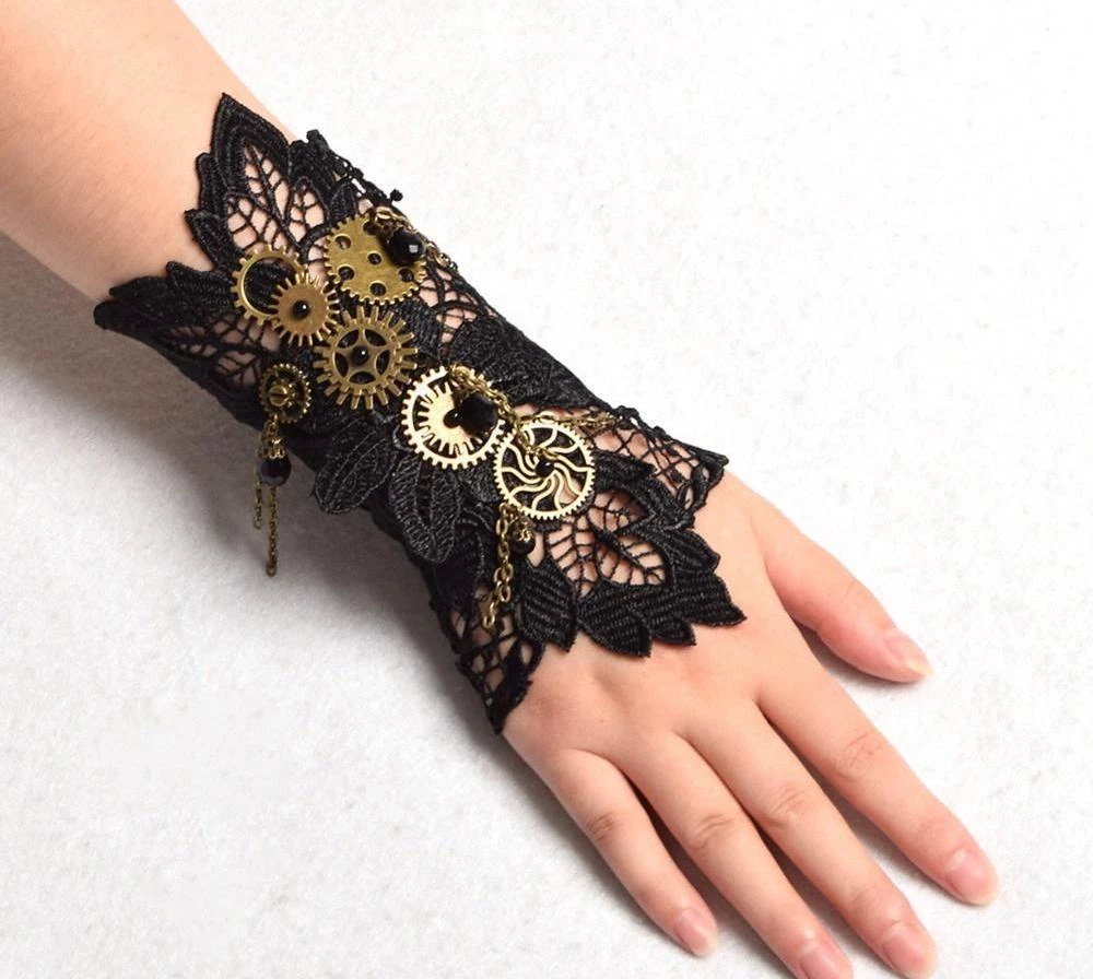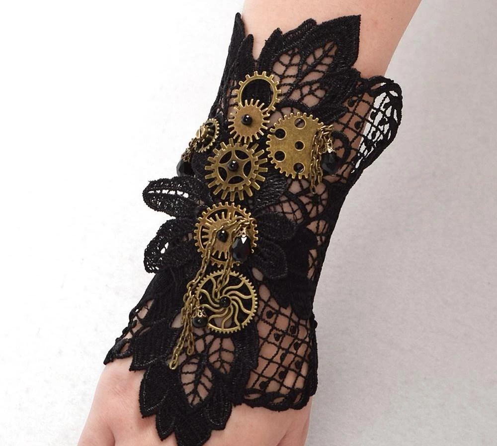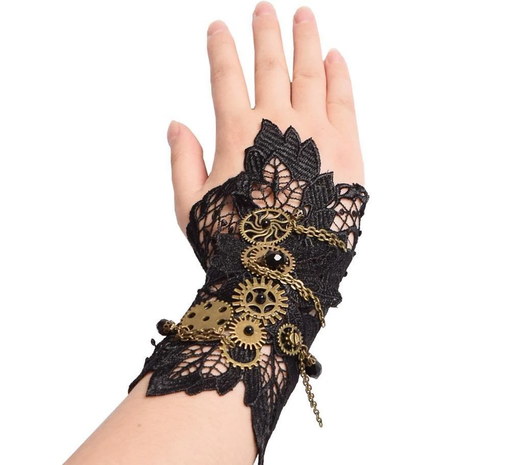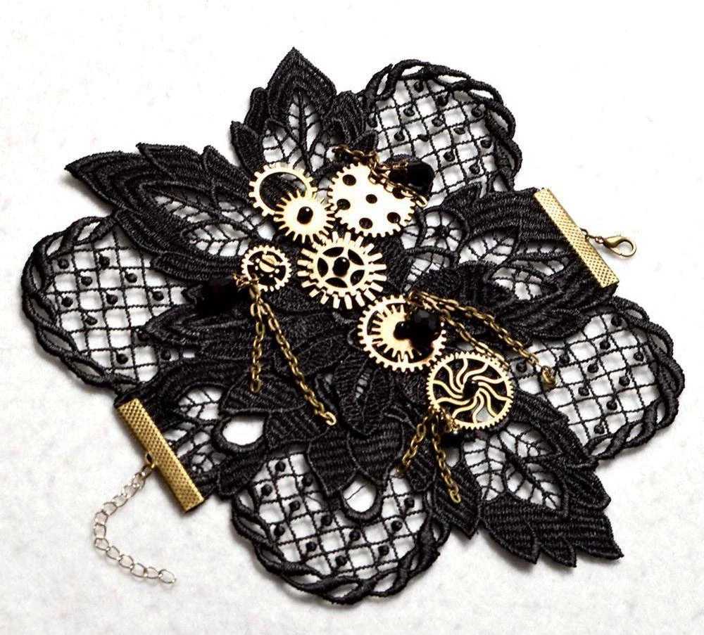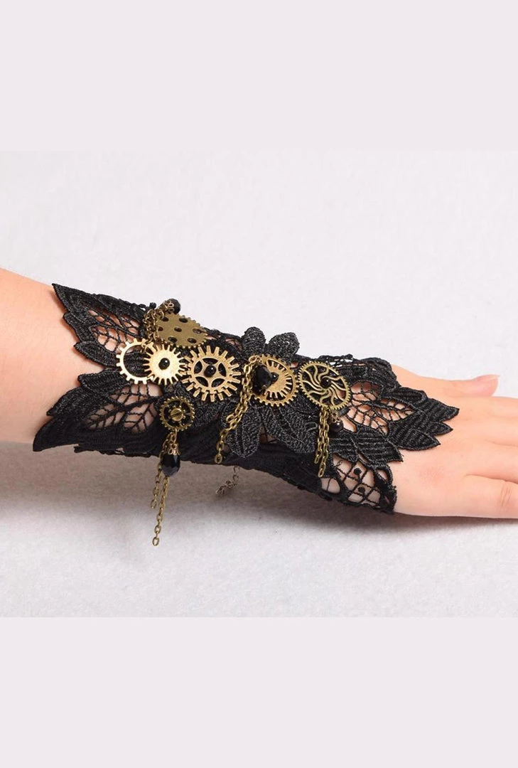 1 Black lace wrist cuff featuring bronze steampunk cogs and chains. One size, adjustable with chain.