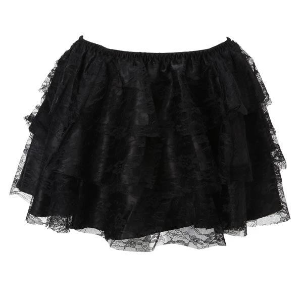 This Gothic Black Skirt has 3 satin-tiered layers with a Classic Lace tiered Overlay. It’s elasticated at the waist. Perfect to match with your corset, Use as a Petticoat or to finish off your Goth Outfit!