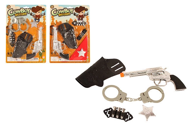 Yeehaw! Capture the bad guy or BE the bad guy with these value gun, badge and accessory packs! Each kit includes 1 toy gun, 1 star badge, 1 holster, 1 set of 3 fake bullets, and either handcuffs or a bandana.