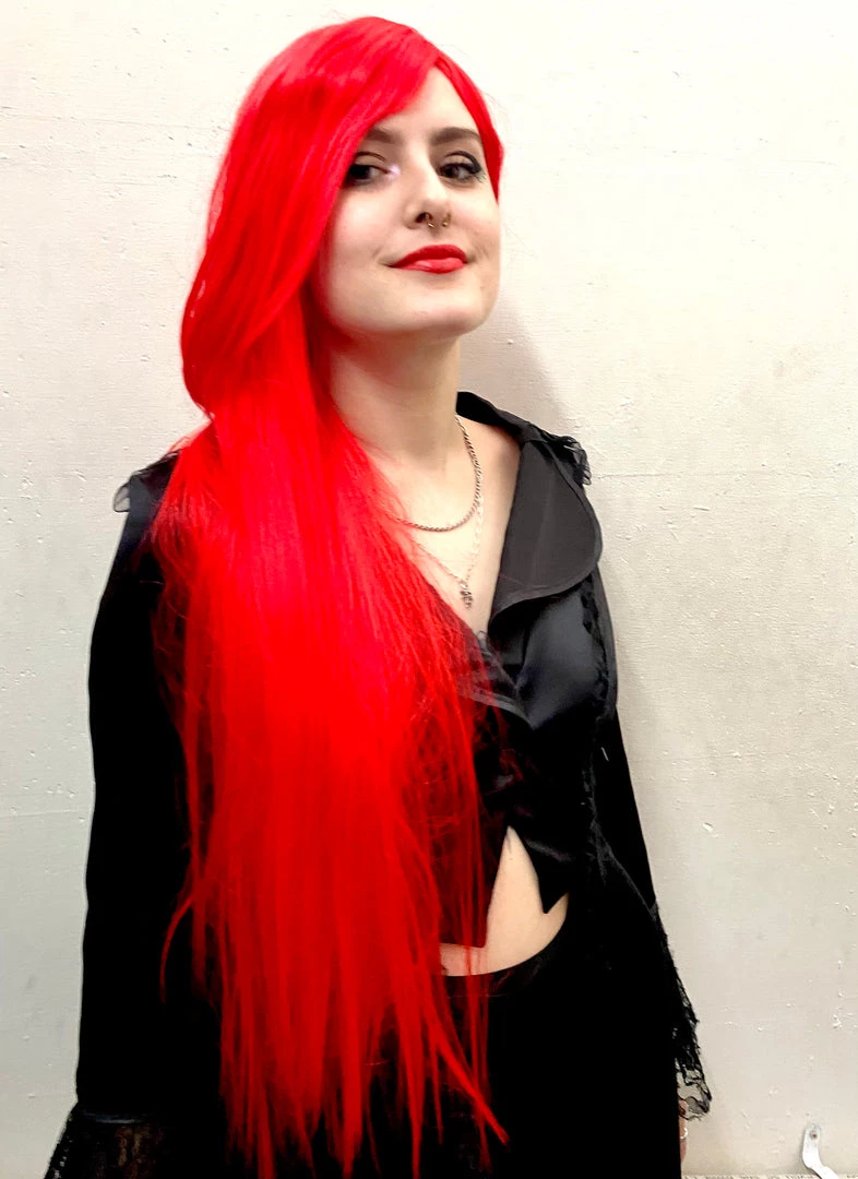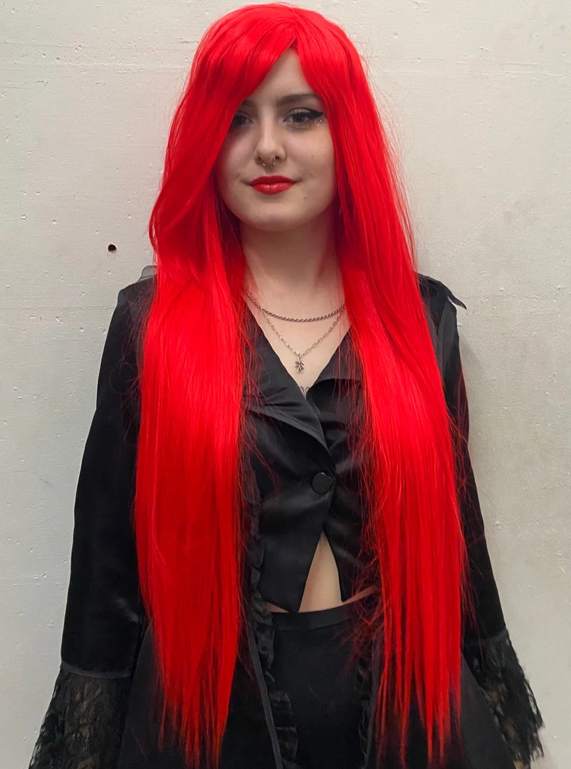 Beautiful thick red straight wig with adjustable sizing and fake scalp. Fringe can be styled to the side or worn traditionally in front, you can even cut them to suit your needs!