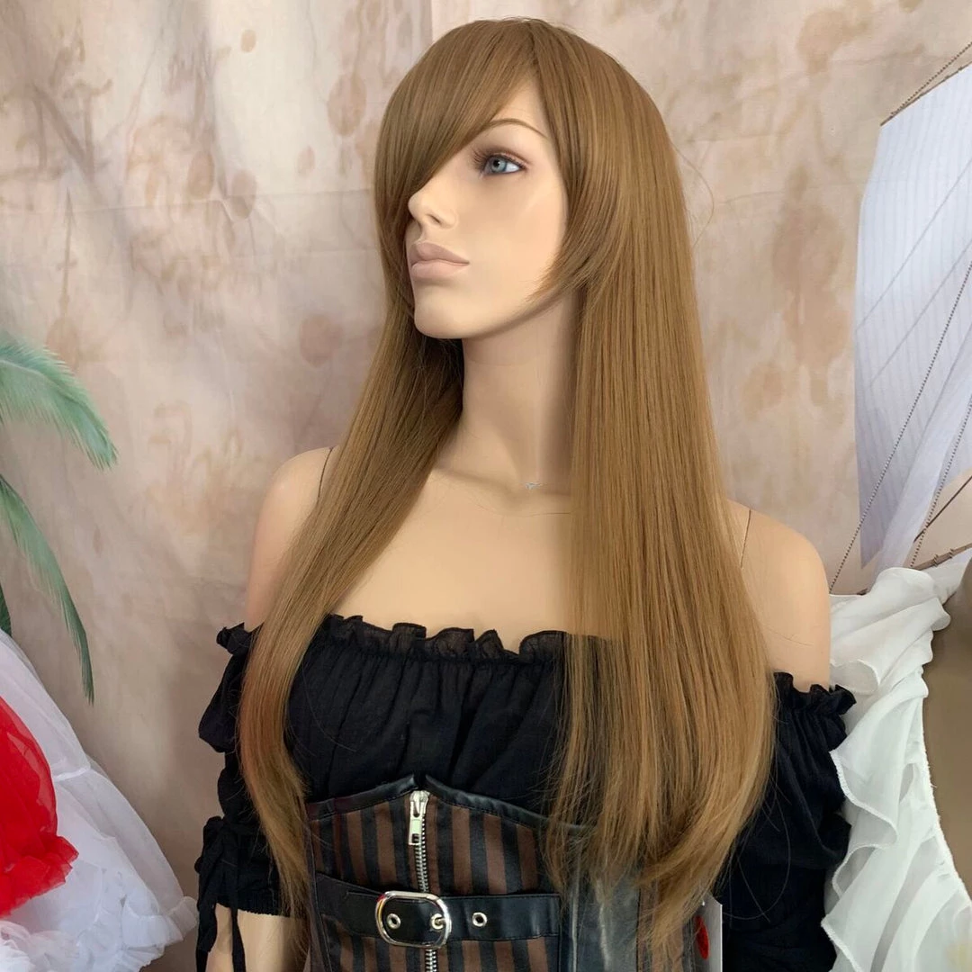 Beautiful thick brown straight wig with adjustable sizing and fake scalp. Fringe can be styled to the side or worn traditionally in front, you can even cut them to suit your needs!