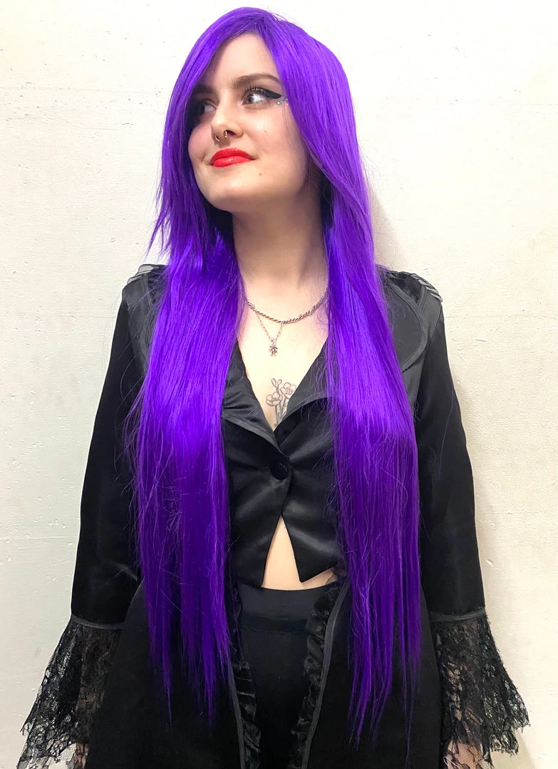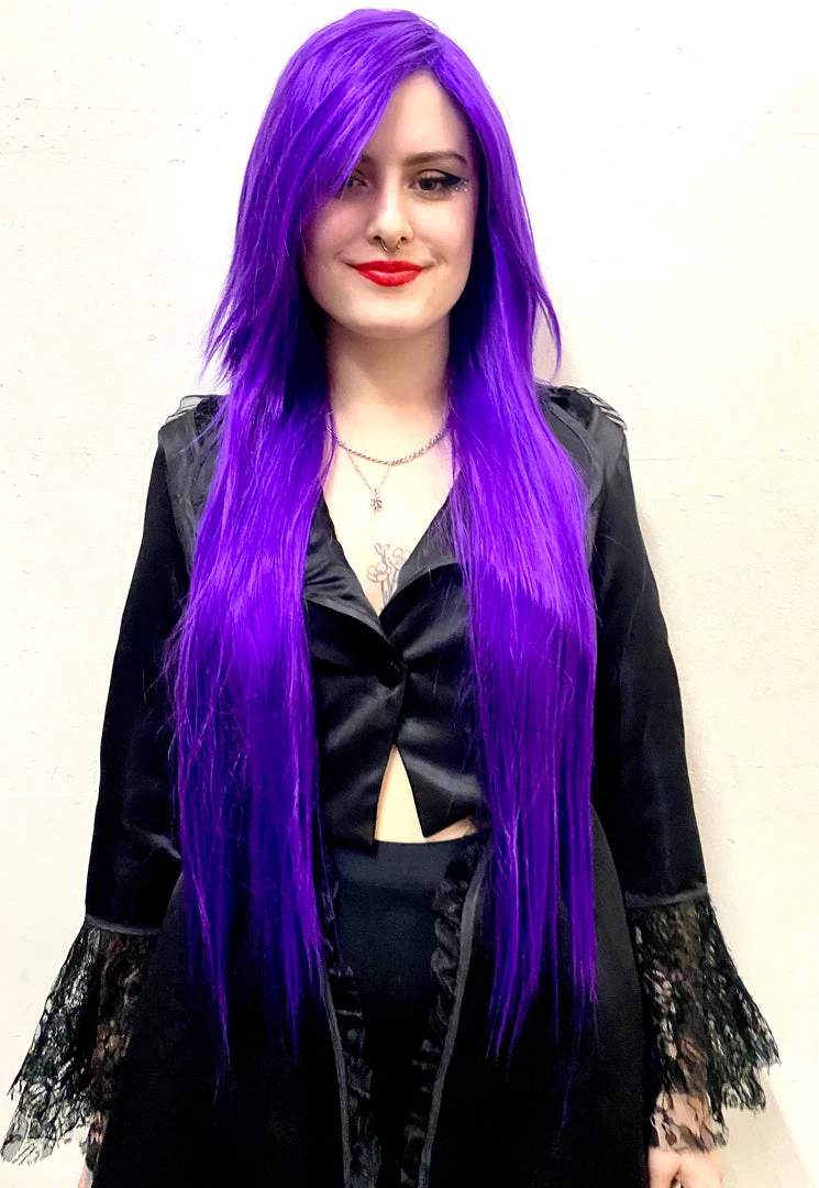 Beautiful thick bright purple wig with adjustable sizing and fake scalp. Fringe can be styled to the side or worn traditionally in front, you can even cut them to suit your needs!