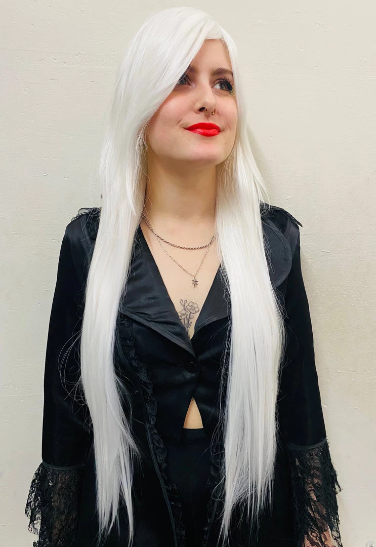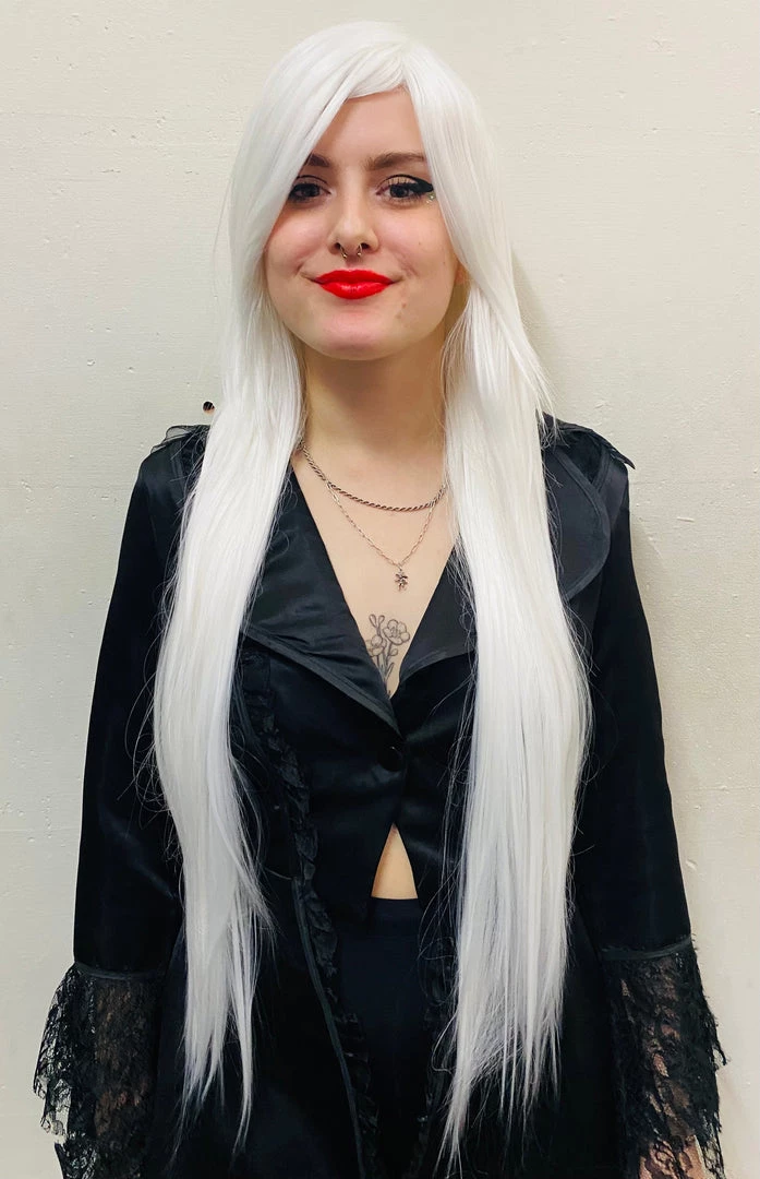 Beautiful white straight wig with adjustable sizing and fake scalp. Fringe can be styled to the side or worn traditionally in front, you can even cut them to suit your needs!