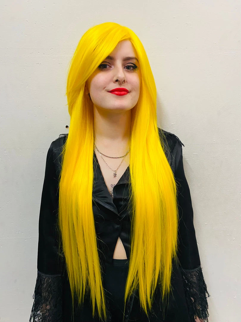 Beautiful thick bright yellow straight wig with adjustable sizing and fake scalp. Fringe can be styled to the side or worn traditionally in front, you can even cut them to suit your needs!