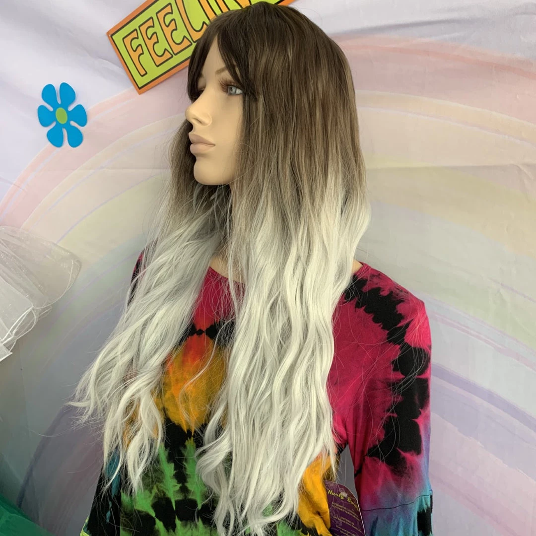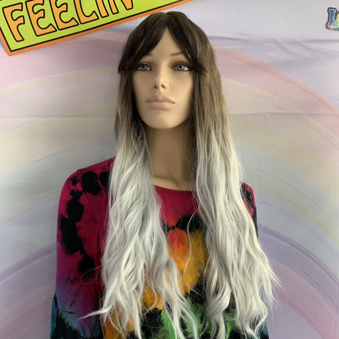 Beautiful thick brown to grey long soft wavy wig with adjustable sizing and fake scalp.