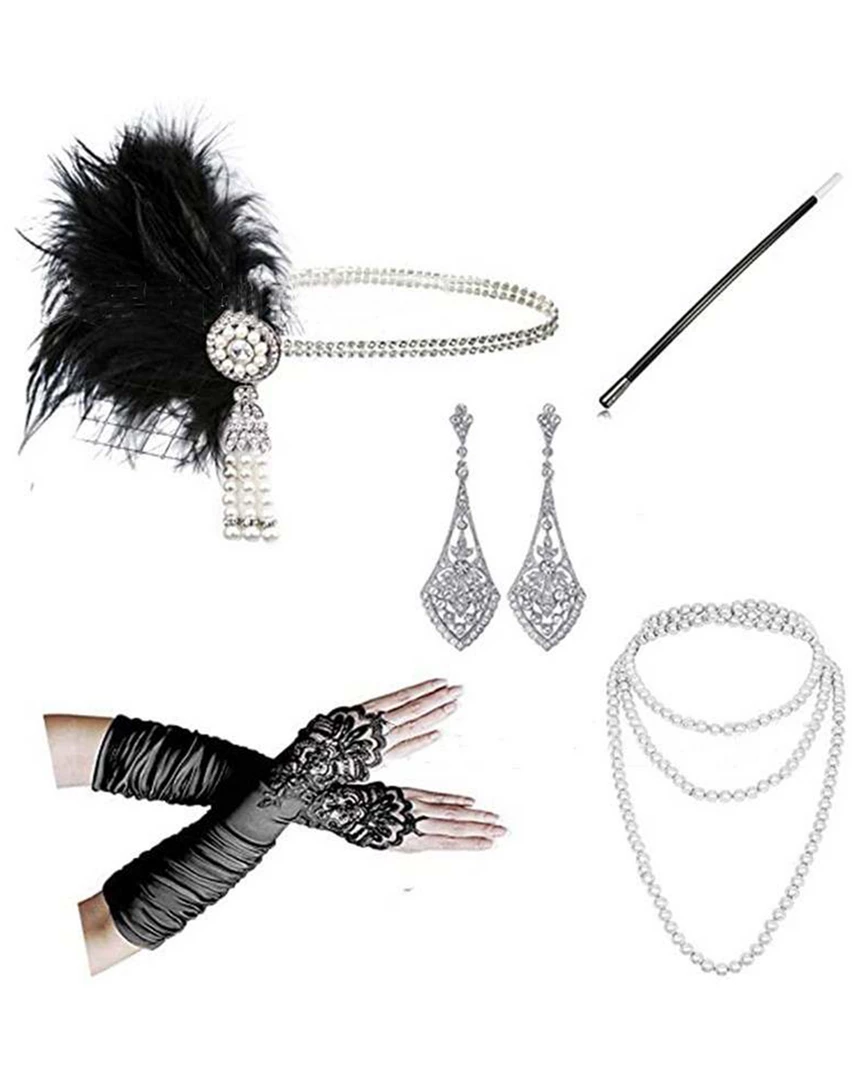 This beautiful Black and Silver Gatsby Flapper set includes a Black Feather Headband with a Silver Pendant, Earrings, Gloves, Cigarette Holder and a Pearl Necklace.