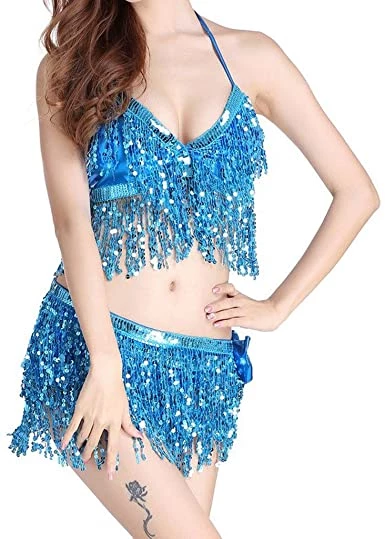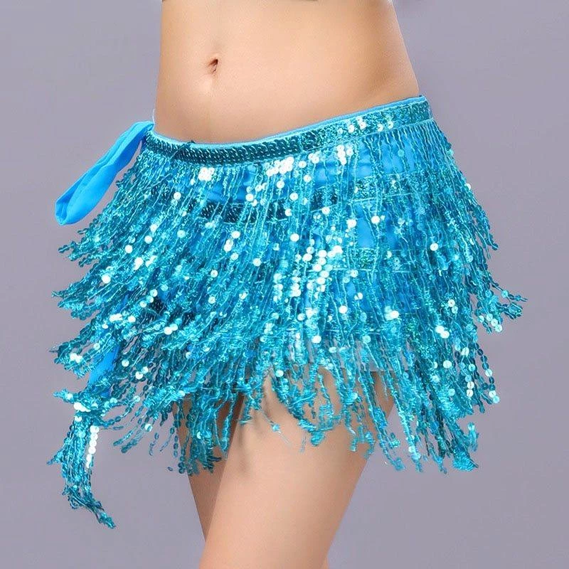 Beautiful blue tie up belt with sequin fringing overlay. Best worn over a body suit or metallic booty shorts for the perfect festival look..