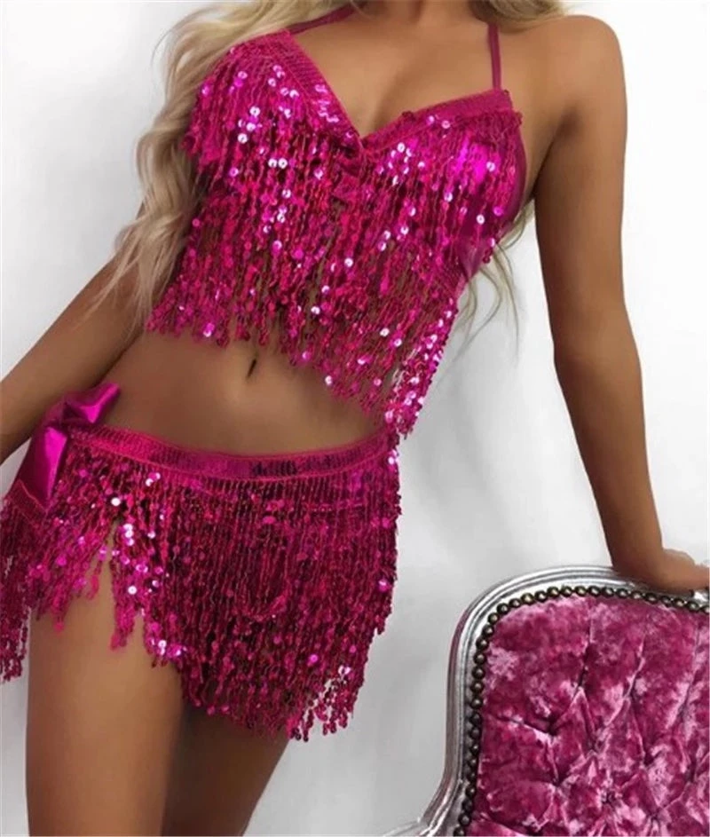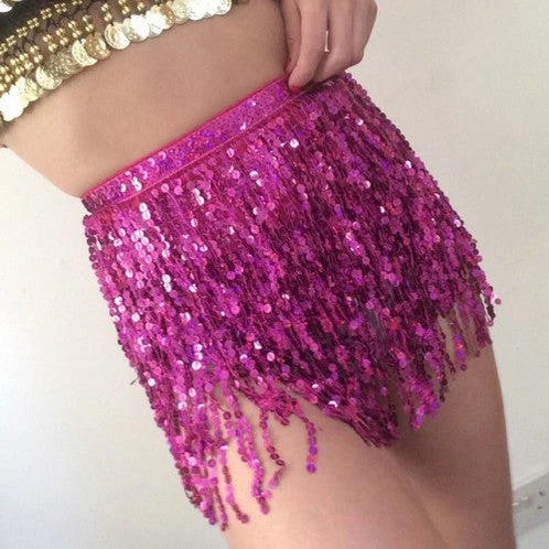 Beautiful deep pink tie up belt with pink sequin fringing overlay. Best worn over a body suit or metallic booty shorts for the perfect festival look..