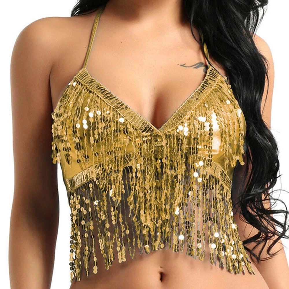 Gold Sequin Belly Dancing Fringe Halter Neck Top. Perfect for your next festival, rave, party or performance!