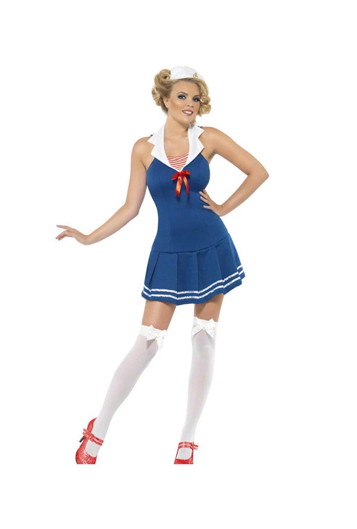 This 2-piece Sailor Cadet costume has a short blue mini DRESS with pleated skirting, red bow and back flap,