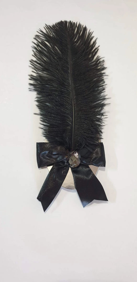 This Beautiful Black Gatsby Feather Bow Hair Clip would be amazing for a Great Gatsby Night Out! This hairclip features a large black feather with a Black Bow with a Black Gem. The hair clip is attached on the back of the bow.