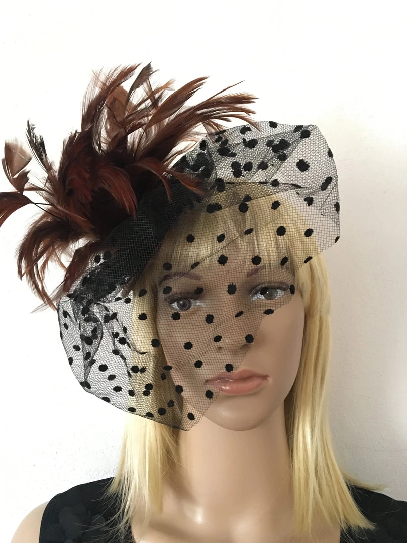 Handmade brown mini top hat with hair clips on the bottom! Decorated with brown feathers, black tulle and an assortment of cogs