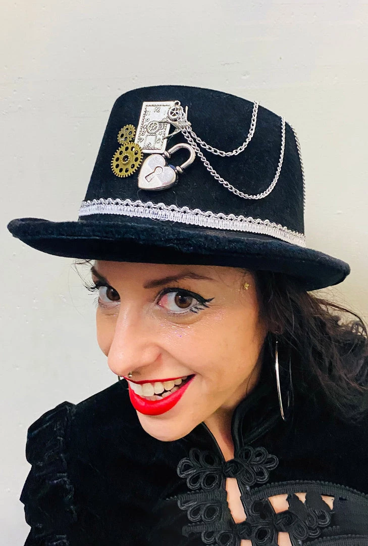 This over-the-top top hat is perfect for an outlandish steampunk outfit. Featuring a silver heart shaped padlock, draped silver chains across the front and cog details with white trim around the band.
