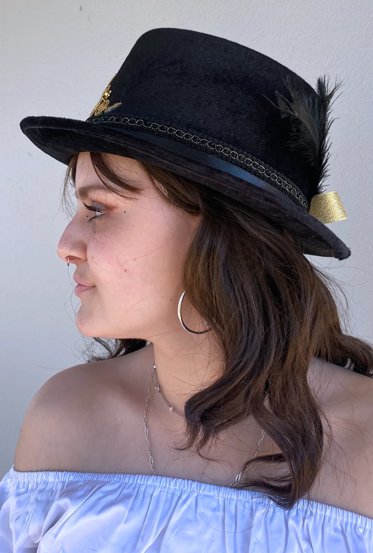Steampunk Cogs and Gold Bow Hat features Multiple Gold Cogs in a row at the front, a Black and Silver Band Trim, a Gold Bow at the back with Three Feathers and a Cog Pendant.