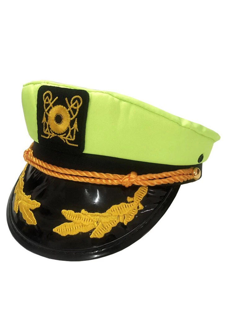 take your nautical costume up a notch with the bright neon yellow pink captain hat with gold detail.