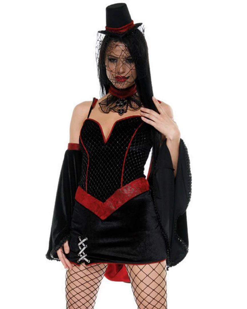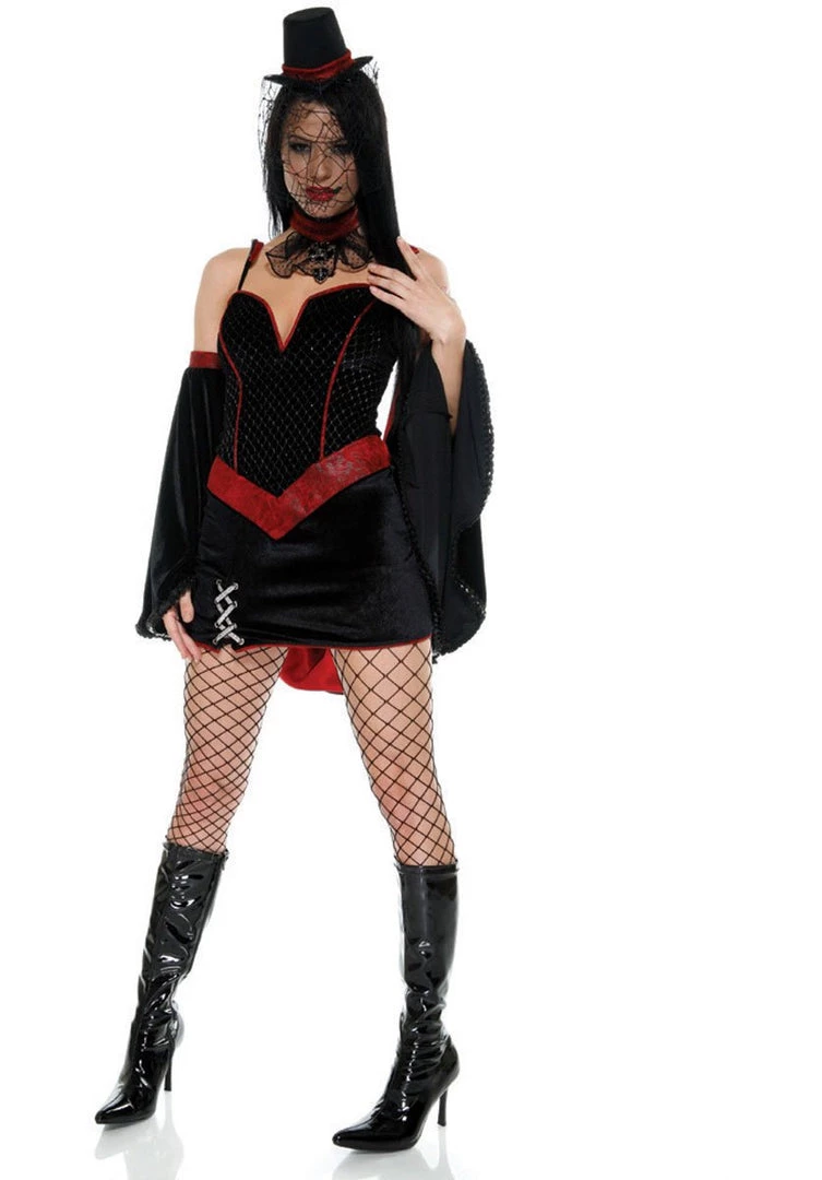 The deluxe women’s vampire costume includes; a sexy black and red strap dress, belled costume sleeves, lace choker and a sexy top hat with a spider web veil to complete the look. This deluxe ladies Halloween outfit will set you apart from the crowd of ghosts and ghouls this spooky season.