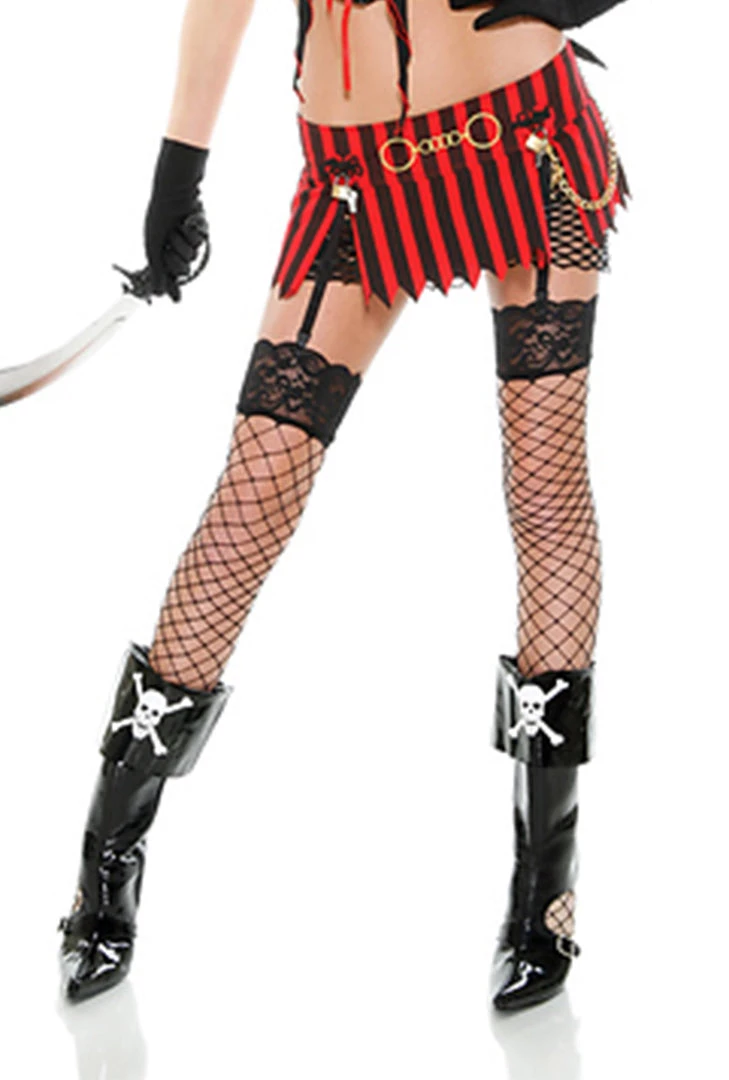 Costume includes a black and red Top, Shiny Black Corset, Red and Black stripe Skirt, prop Sword and Boot Covers.