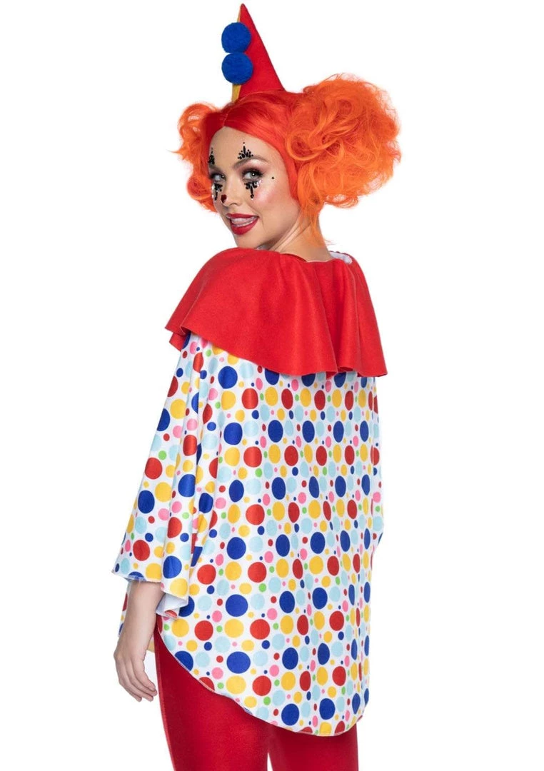 This relaxed style fits sizes XS to XL and includes a comfortable poncho with pom pom accents and a cute matching clown hat.