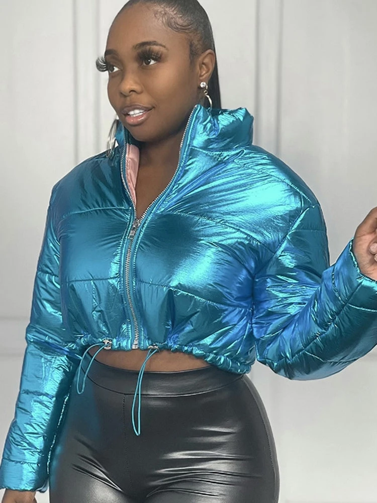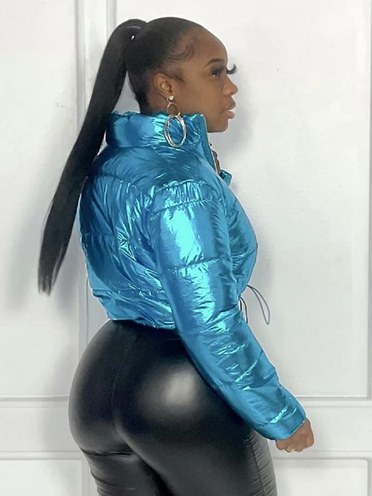 Global Lover Metallic Blue High Neck Puffer Jacket