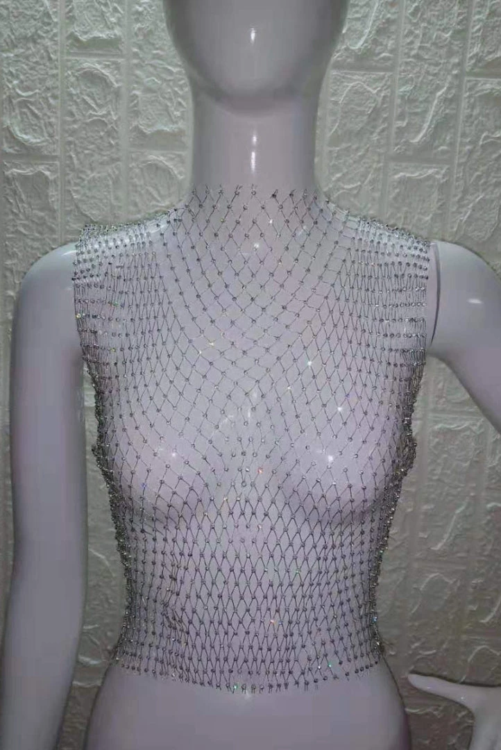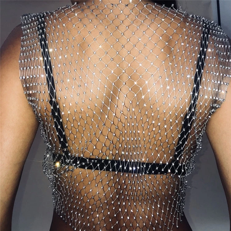 Shine bright like a diamond in this Fishnet Top! Fishnet Top is made out of a Grey Net Material with Rhinestones.