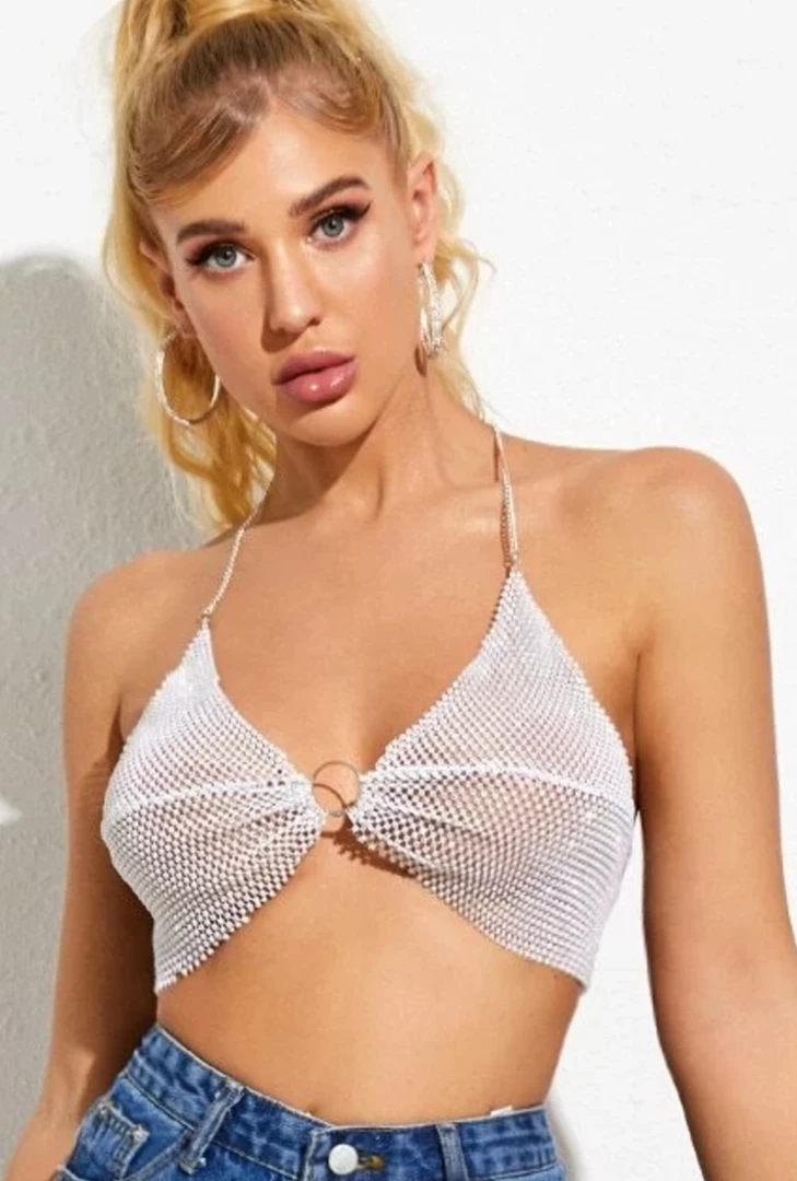 This top will give you Festival Fever! The White Halter Bra Top is made out of a White Rhinestone Mesh Material with an O-Ring attaching the material in the middle.