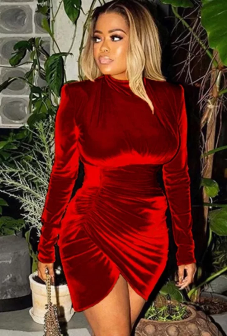 The Red Velvet Wrap Dress is the Hot Hot Dress for a night out! Dress has a High Neck Cut with Long Sleeves, and a Wrap Around Skirt Style.