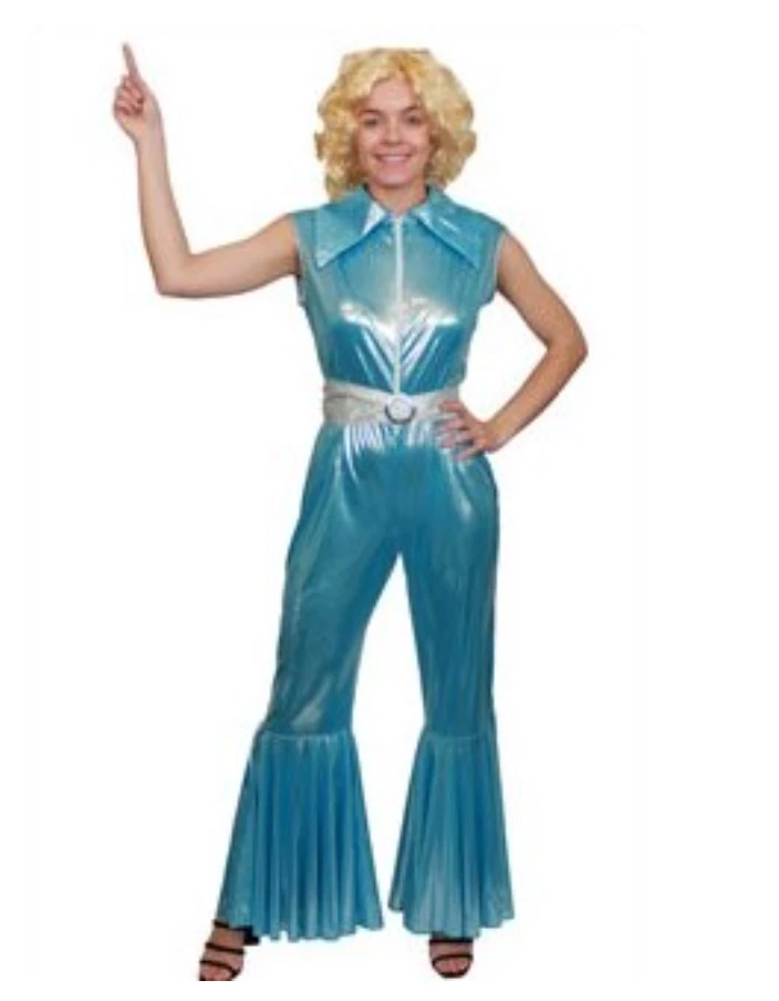 This stunning jumpsuit is made out of Stretchy Metallic Blue material. It features a high neck collar with no sleeves and a front zip closure, Flared Bell-Bottom style legs and a Silver round belt to wear on the waist. Perfect for your next ABBA event or a 70s themed party!