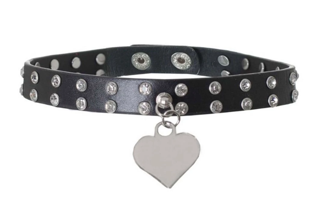 Black choker with a push button clasp, gorgeous diamanté details and a love heart charm. Guaranteed to spruce up any outfit!