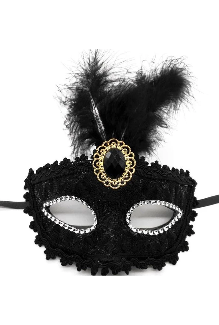 Our Lace Black Feather Masquerade Mask features an all-over lace material over the eye-mask with rhinestone trim around the eyes. It also has a large feather with a gem pendant in the middle and elasticated band.