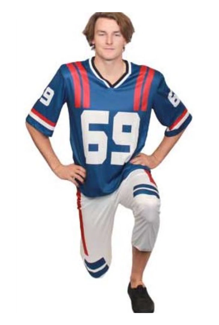 includes White pants with Stripe Blue and Red details and a Blue, Red and White Football Shirt with the Player Number 69.
